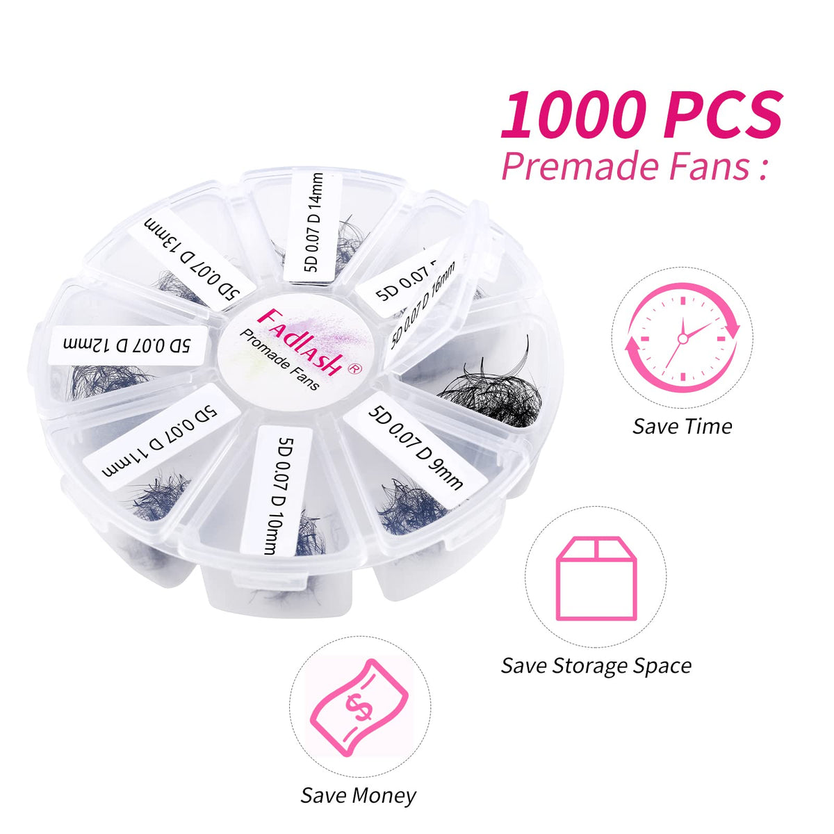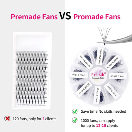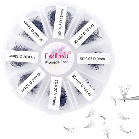 - Budgetvänligt val: Fadlash 5D D curl; tjocklek: 0,07 mm; blandad längd på 9-16 mm, våra lösa promade-fläktar kommer i paket med 1000 fläktar (+-2%), 8,3 gånger mängden av andra 12-raders förgjorda fransfläktar. Fadlash promade fans är den mest budgetvänliga lösningen.